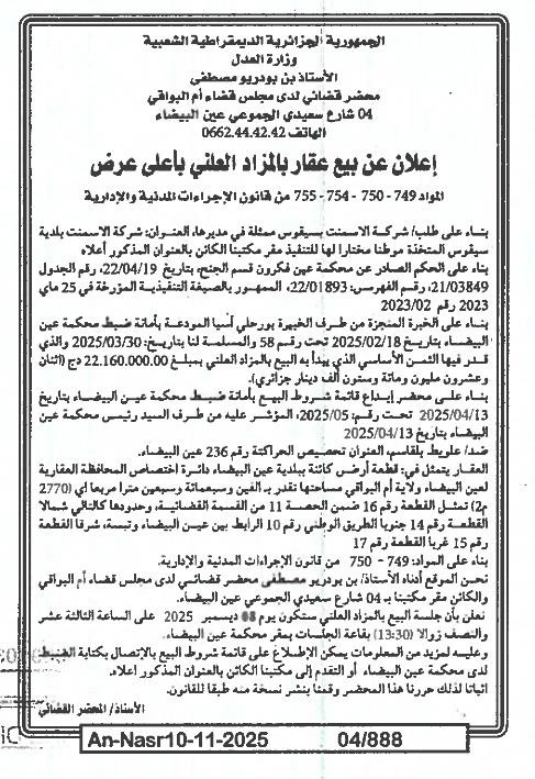 Il sera procédé à la vente au plus offrant et dernier enchérisseur le :