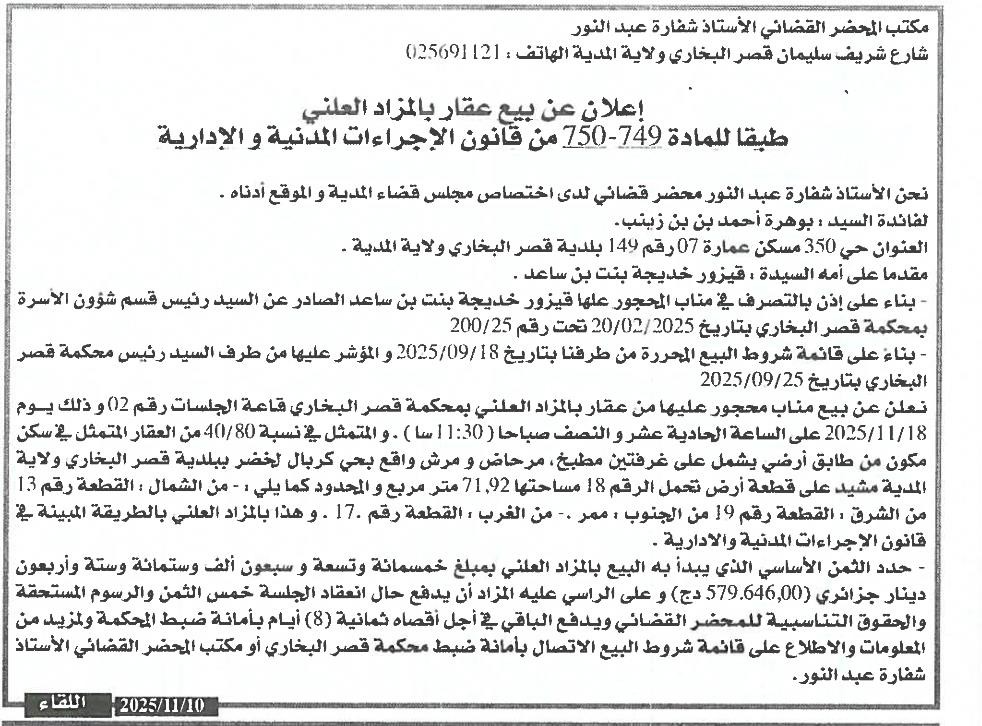 Il sera procédé à la vente au plus offrant et dernier enchérisseur le : 17/11/2025';