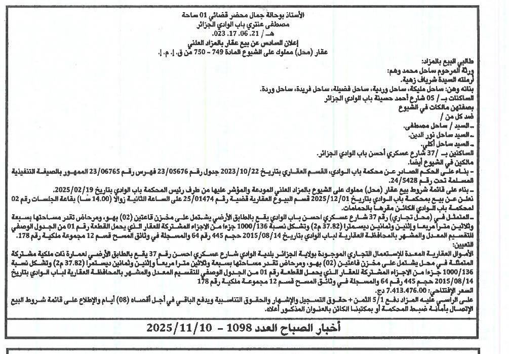 Il sera procédé à la vente au plus offrant et dernier enchérisseur le : 17/11/2025';
