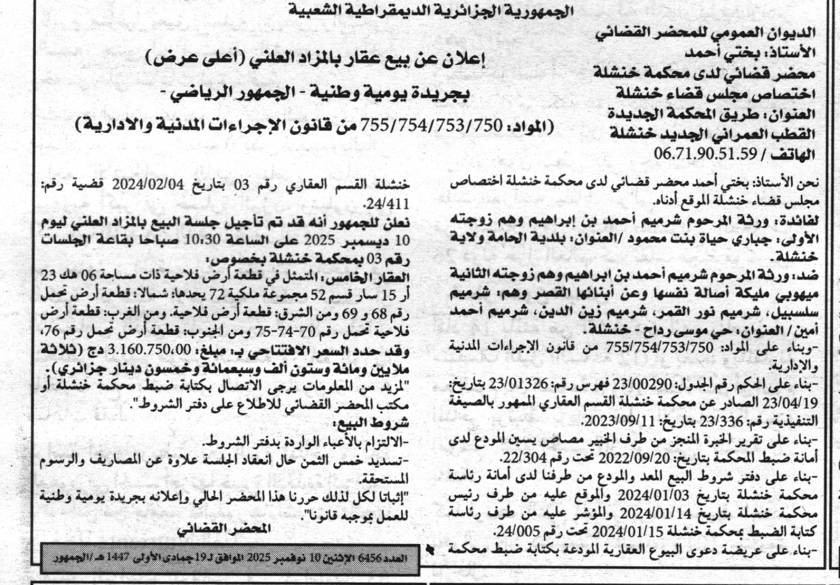 Il sera procédé à la vente au plus offrant et dernier enchérisseur le : 10/12/2025';