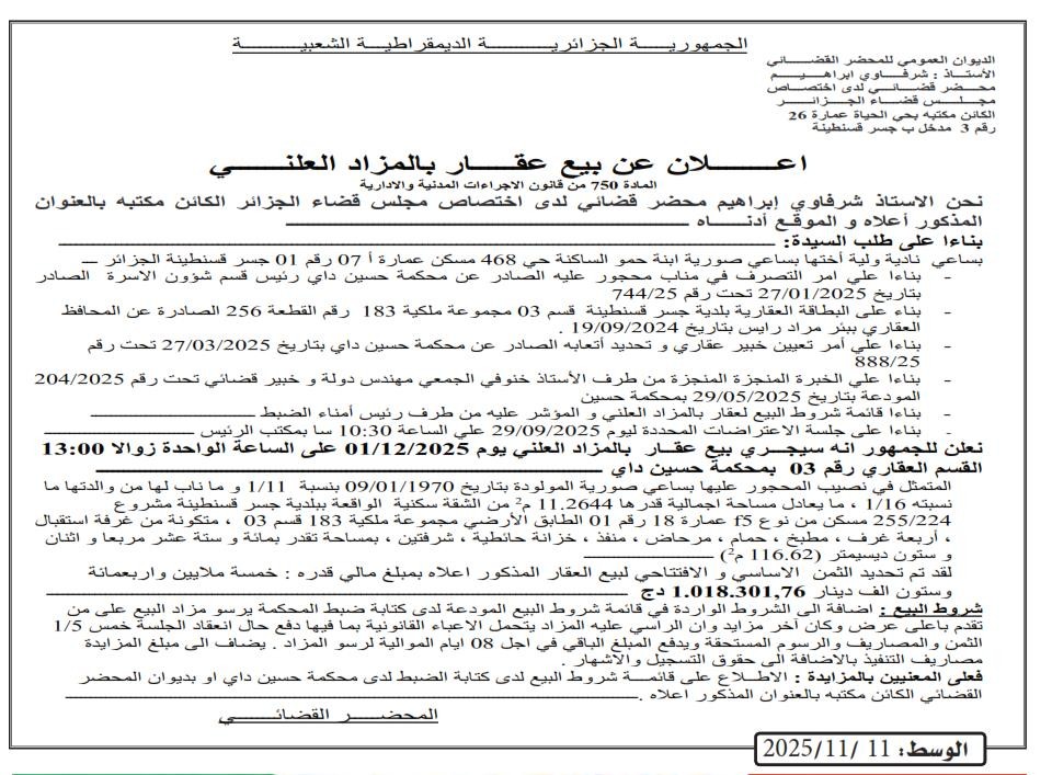 Il sera procédé à la vente au plus offrant et dernier enchérisseur le :