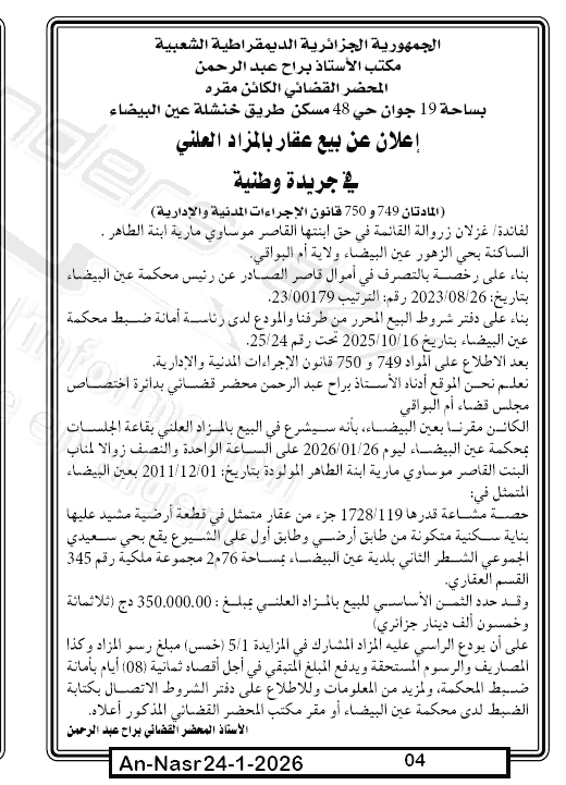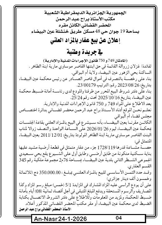 Il sera procédé à la vente au plus offrant et dernier enchérisseur le :