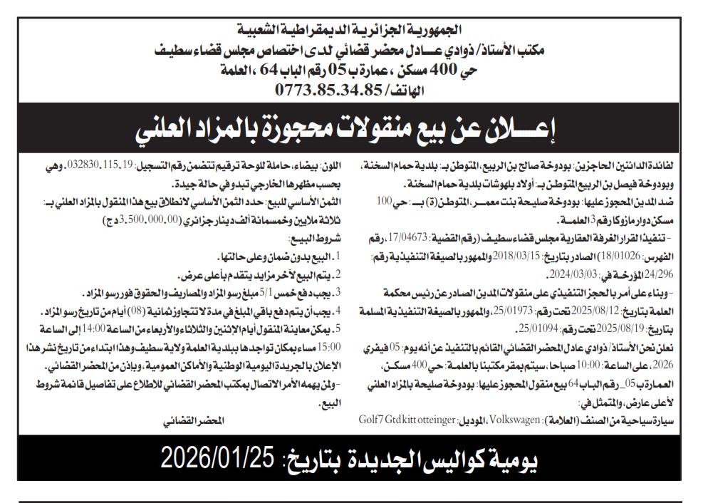 Il sera procédé à la vente au plus offrant et dernier enchérisseur le :