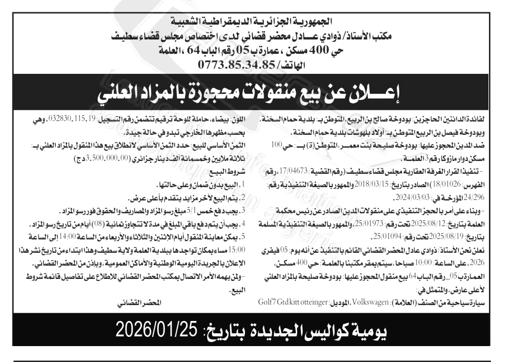 | Objet: Véhicule de tourisme de marque Volkswagen, modèle Golf 7, couleur blanche | |