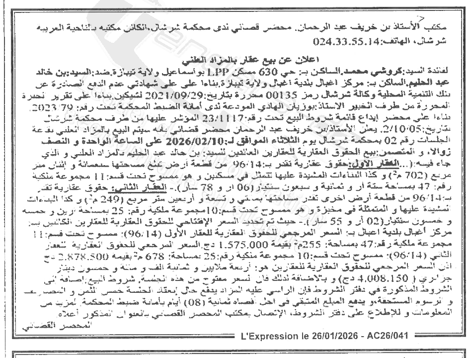 Il sera procédé à la vente au plus offrant et dernier enchérisseur le : 02/02/2026';