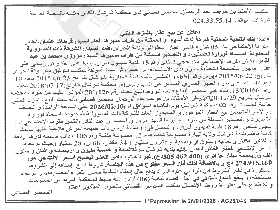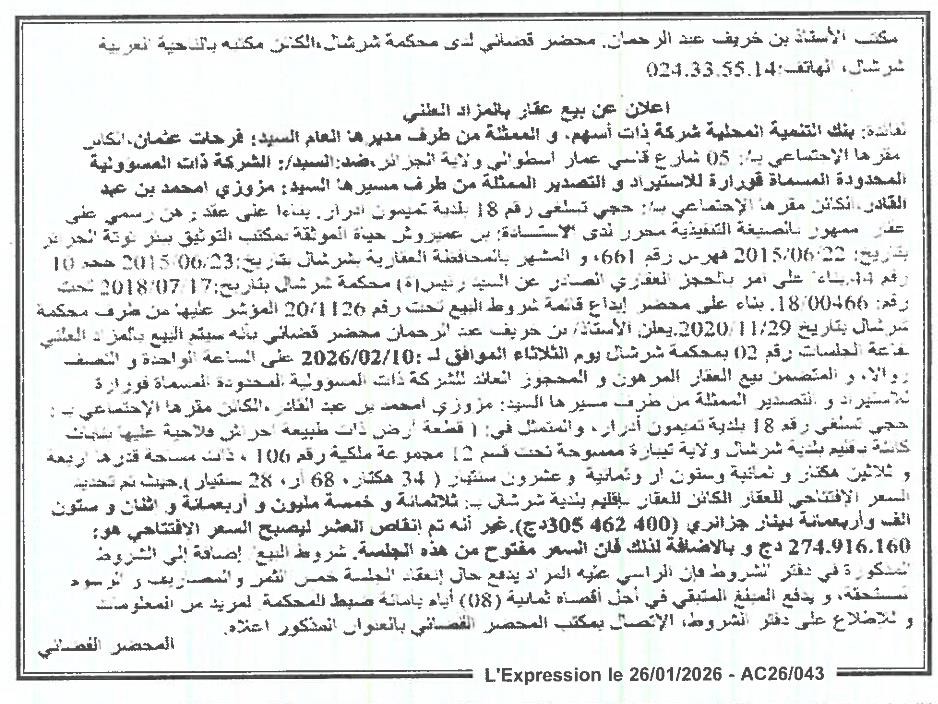 Il sera procédé à la vente au plus offrant et dernier enchérisseur le :