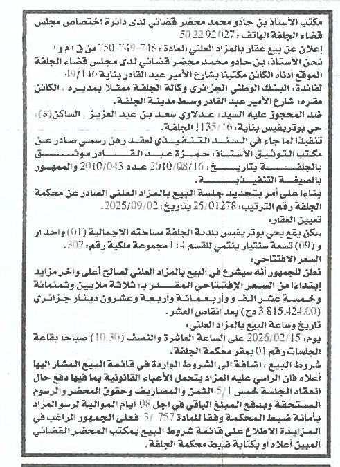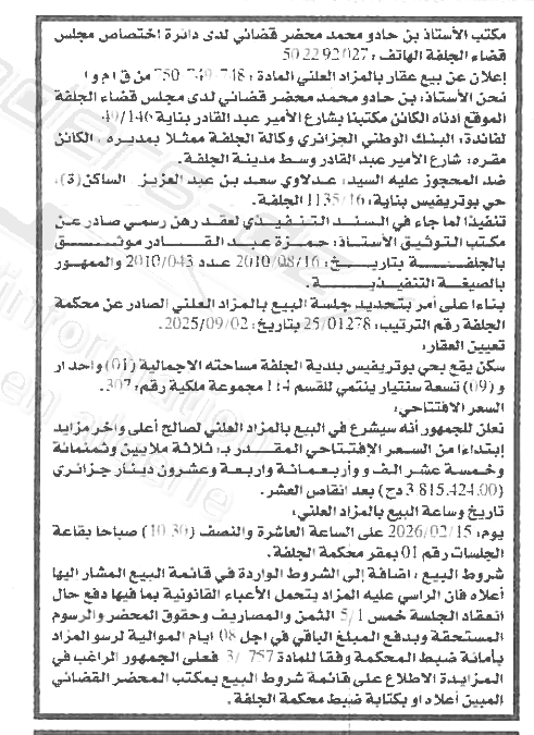 Il sera procédé à la vente au plus offrant et dernier enchérisseur le : 15/02/2026';