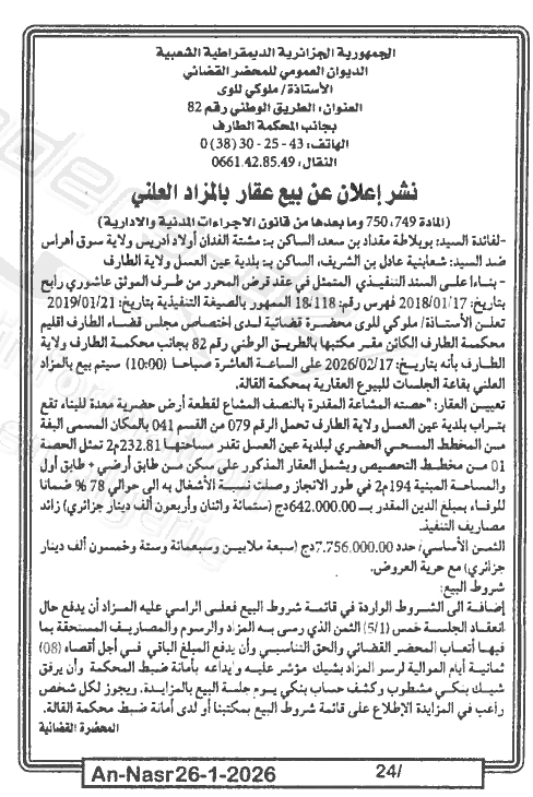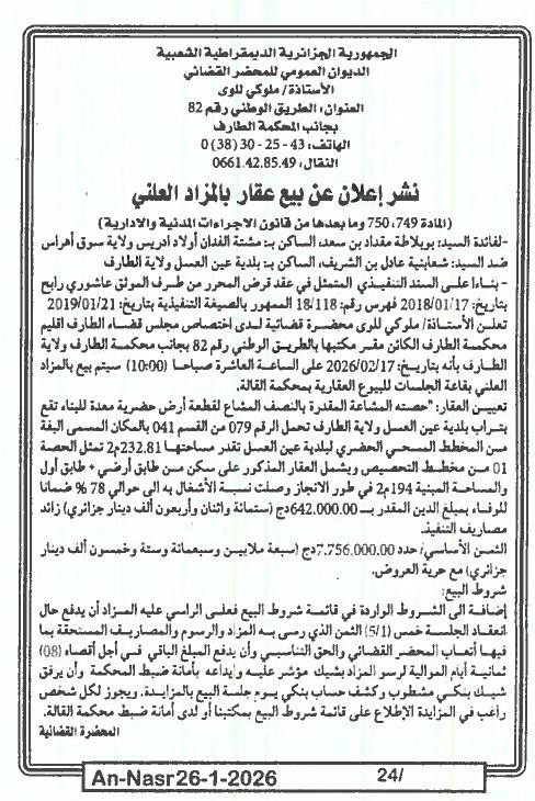 Il sera procédé à la vente au plus offrant et dernier enchérisseur le :