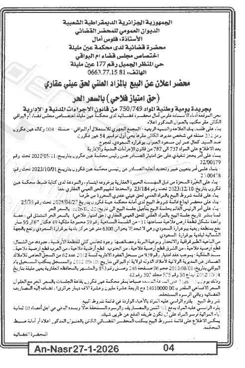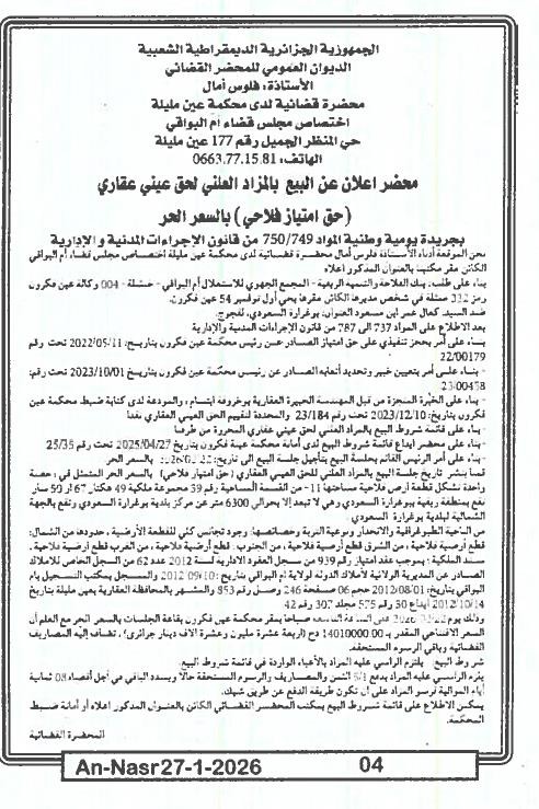 Il sera procédé à la vente au plus offrant et dernier enchérisseur le : 22/02/2026';