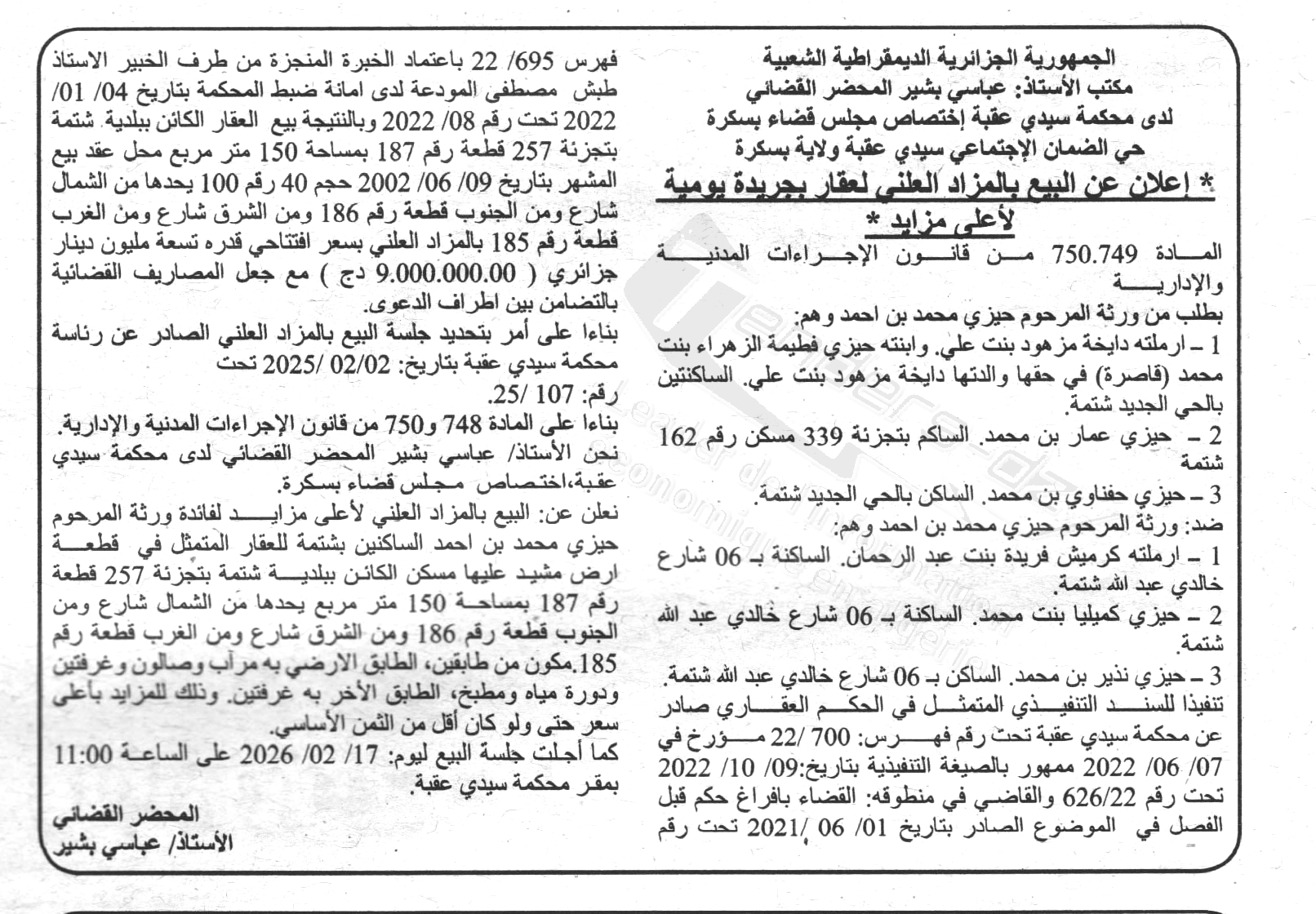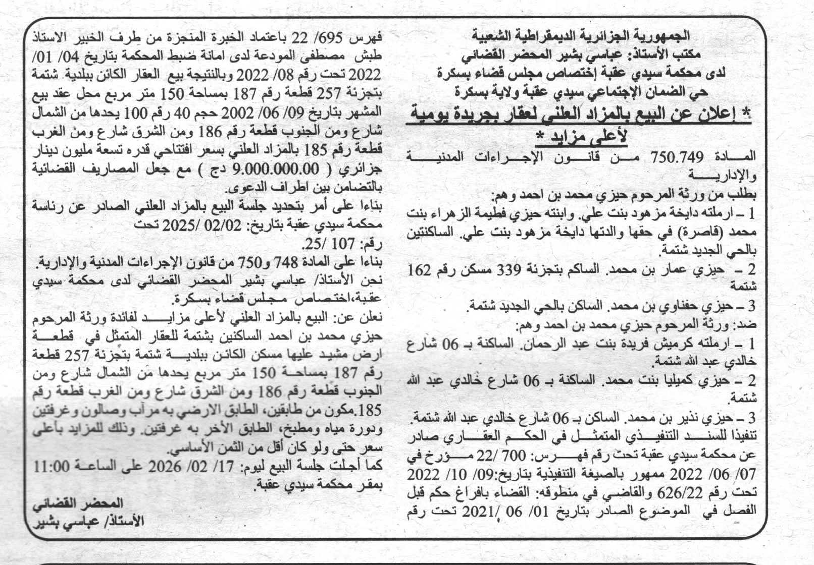 Il sera procédé à la vente au plus offrant et dernier enchérisseur le :