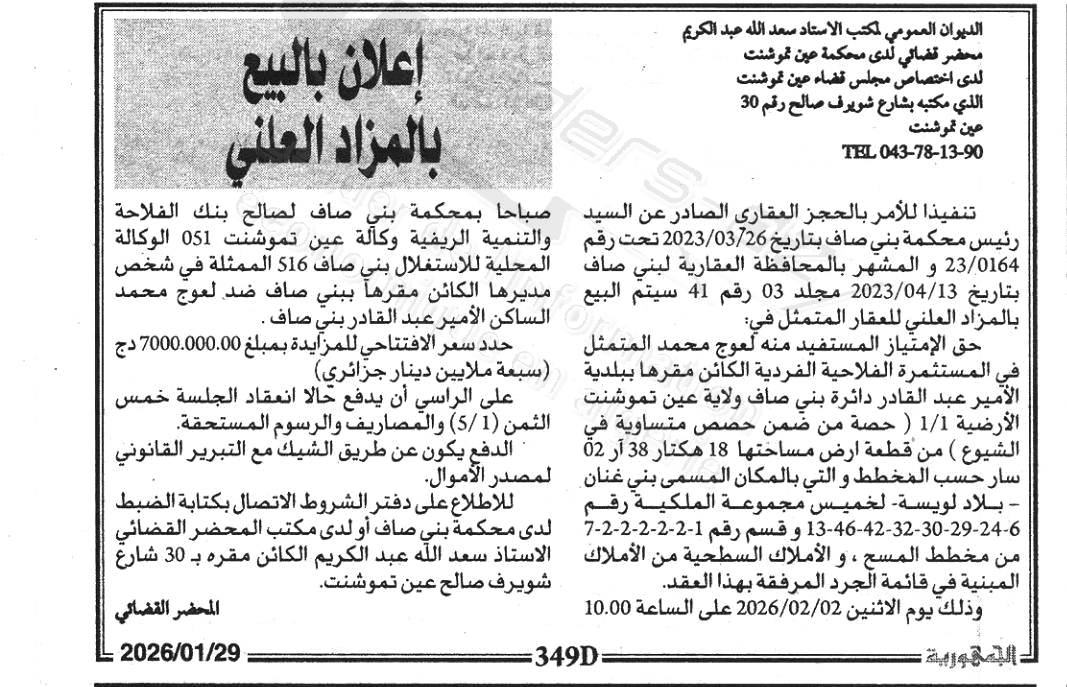 Il sera procédé à la vente au plus offrant et dernier enchérisseur le : 02/02/2026';