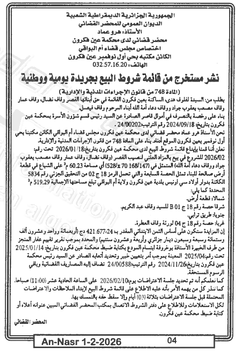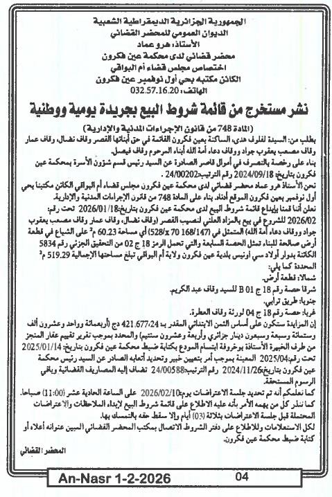 Il sera procédé à la vente au plus offrant et dernier enchérisseur le : 08/02/2026';