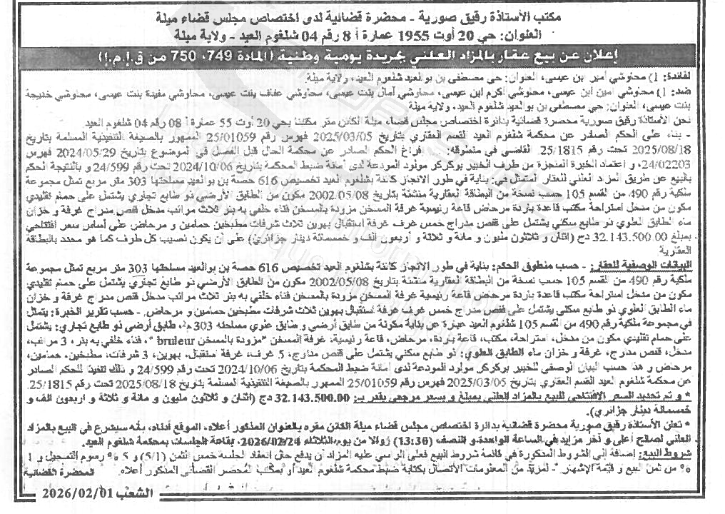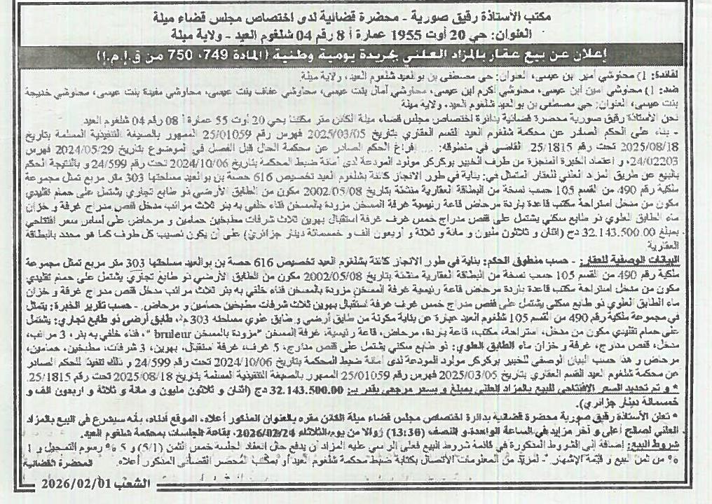 Il sera procédé à la vente au plus offrant et dernier enchérisseur le : 24/02/2026';
