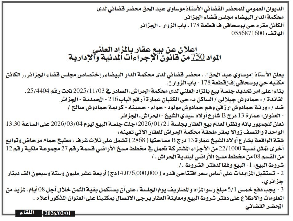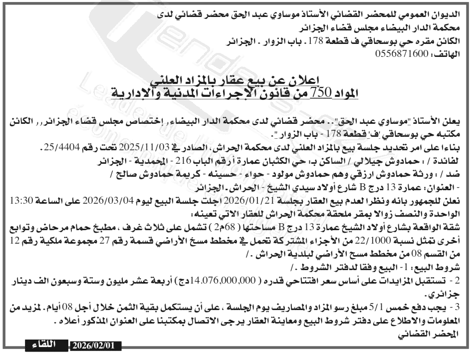 Il sera procédé à la vente au plus offrant et dernier enchérisseur le :