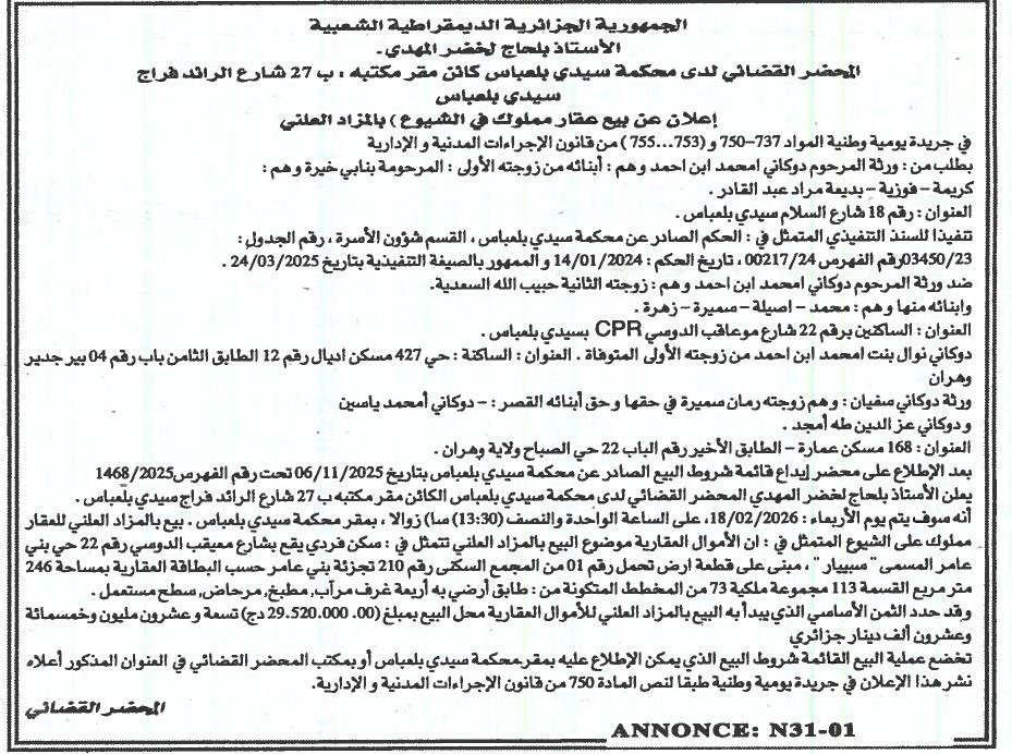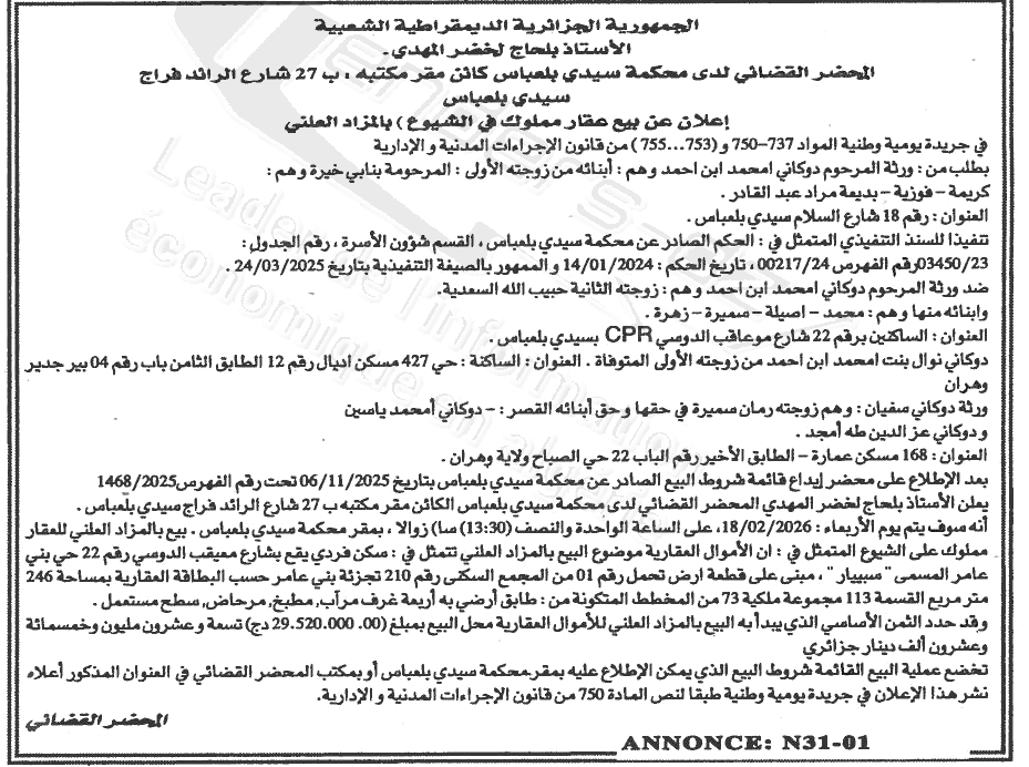 Il sera procédé à la vente au plus offrant et dernier enchérisseur le :