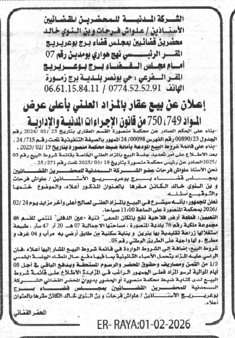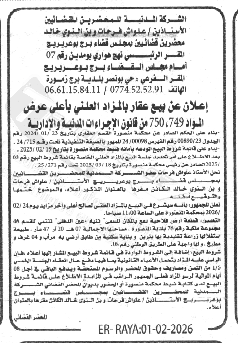 Il sera procédé à la vente au plus offrant et dernier enchérisseur le : 24/02/2026';