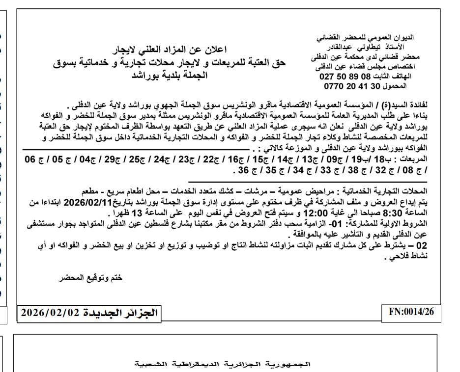 De : Location du droit de seuil des emplacements destinés à l’activité des grossistes en fruits et légumes ainsi que des locaux commerciaux et de services au sein du marché de gros des fruits et légumes de Bourached, wilaya d’Aïn Defla.