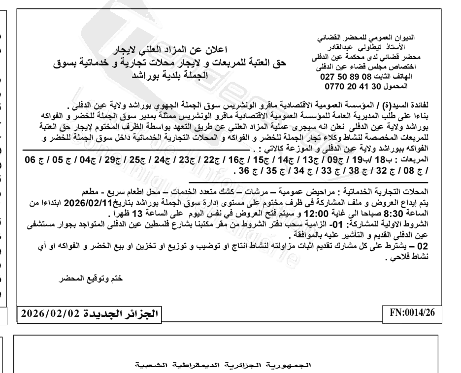 Location du droit de seuil des emplacements destinés à l’activité des grossistes en fruits et légumes ainsi que des locaux commerciaux et de services au sein du marché de gros des fruits et légumes de Bourached, wilaya d’Aïn Defla.