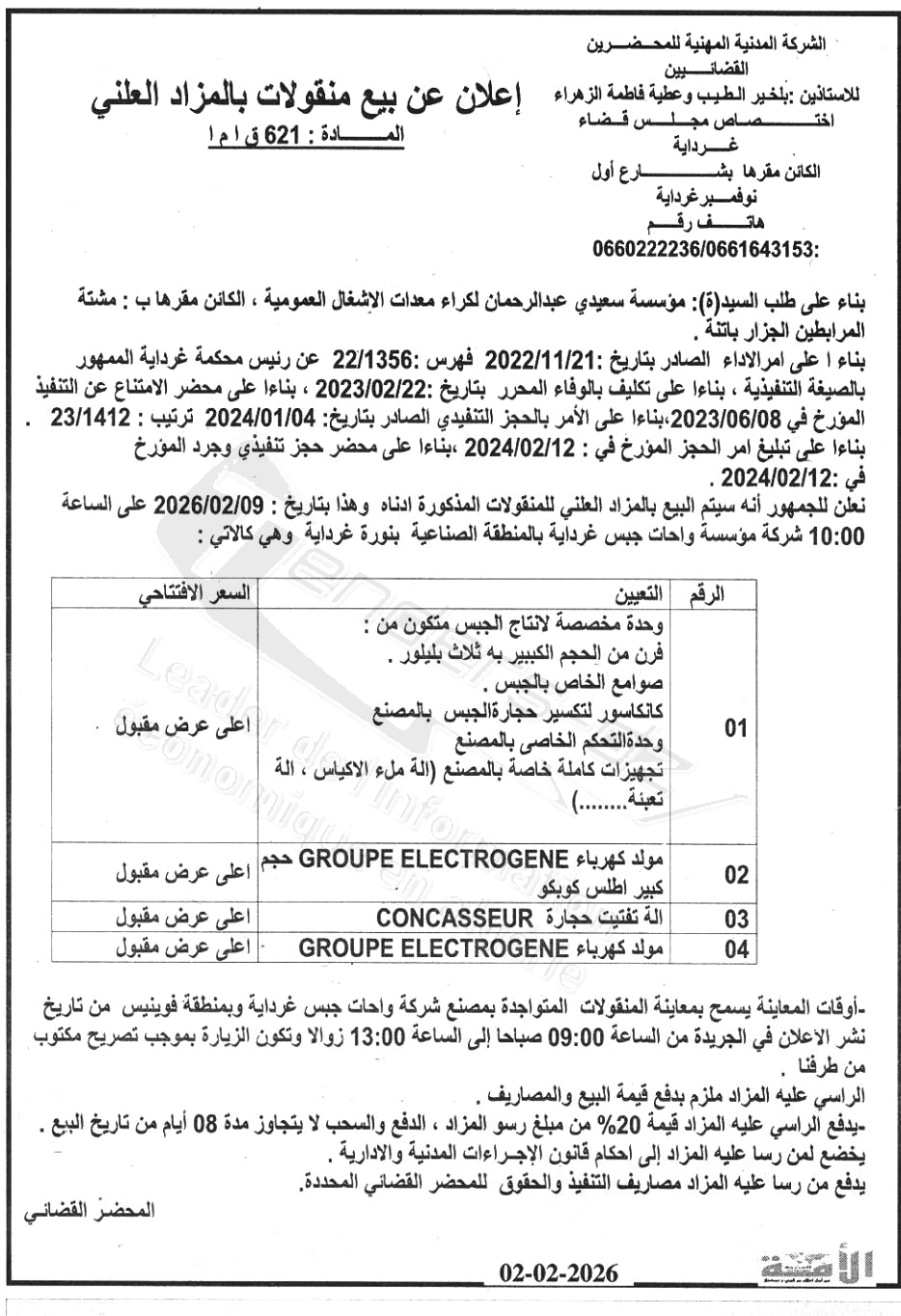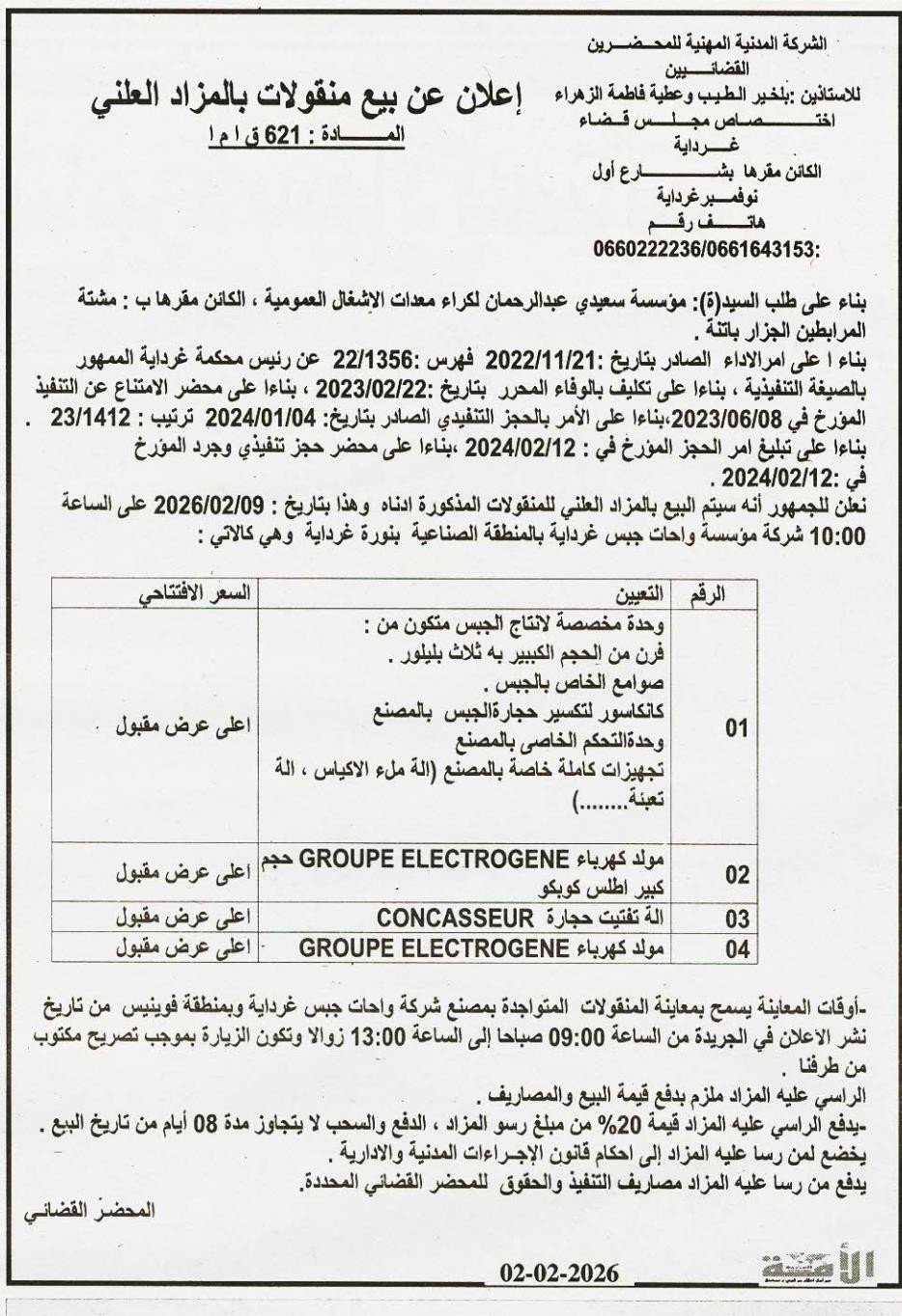 Il sera procédé à la vente au plus offrant et dernier enchérisseur le : 09/02/2026';