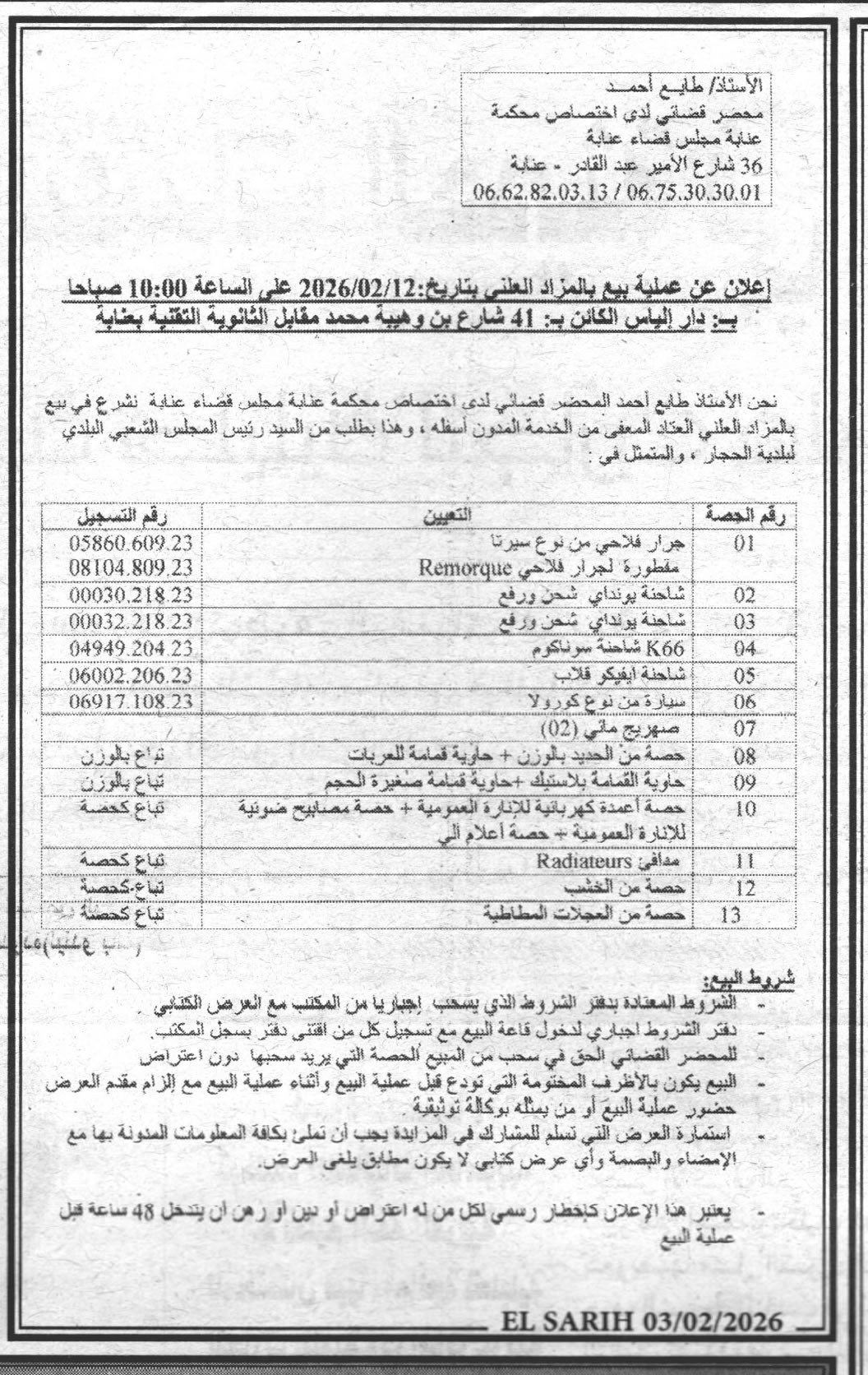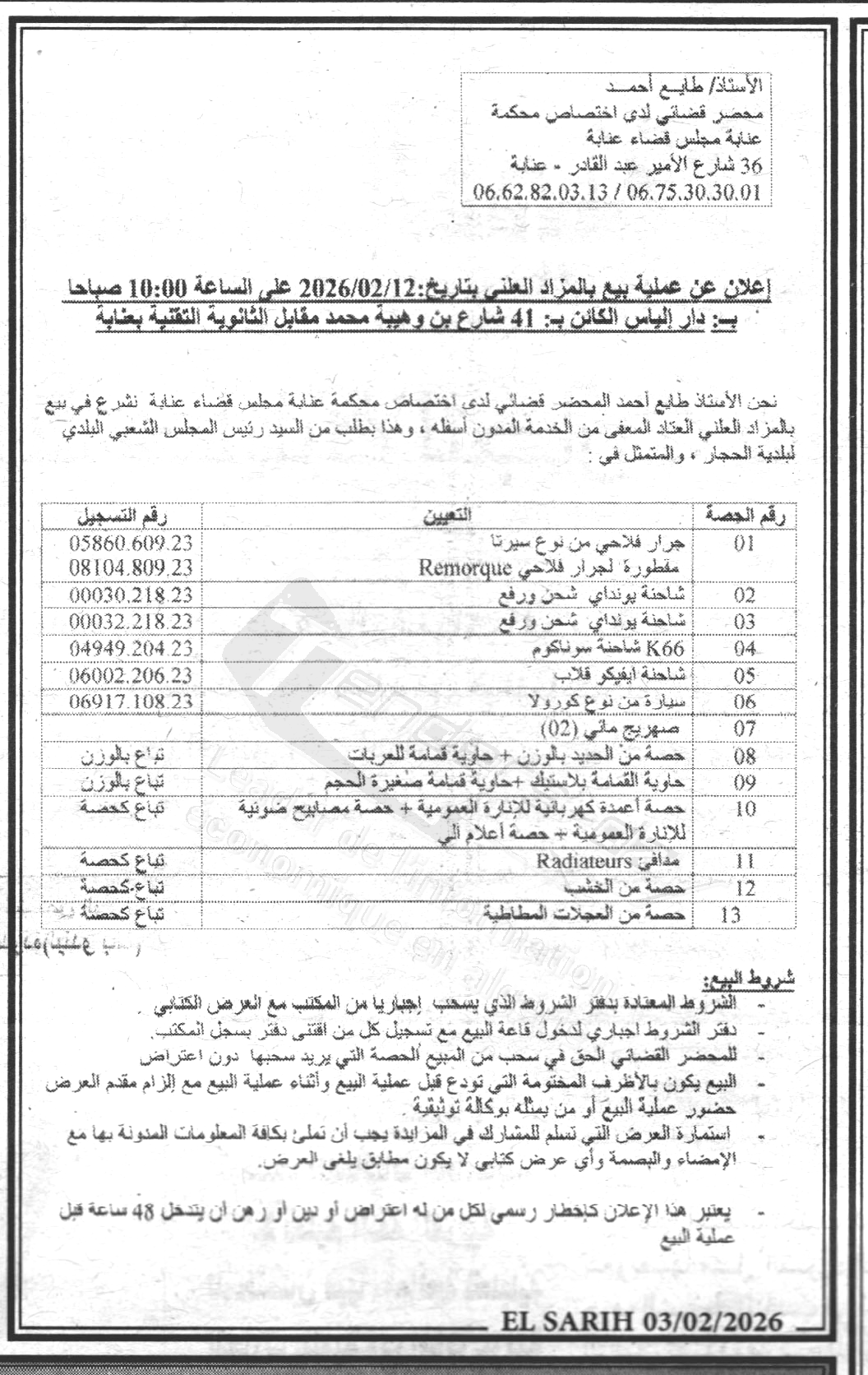 Il sera procédé à la vente au plus offrant et dernier enchérisseur le : 12/02/2026';