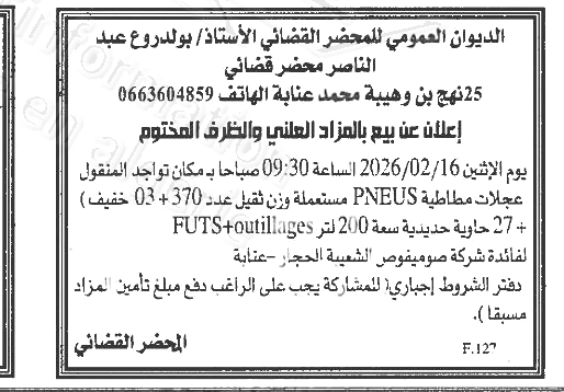 | Objet: Vente des Pneus usagés : 370 unités pour poids lourds + 03 unités pour véhicules légers | |