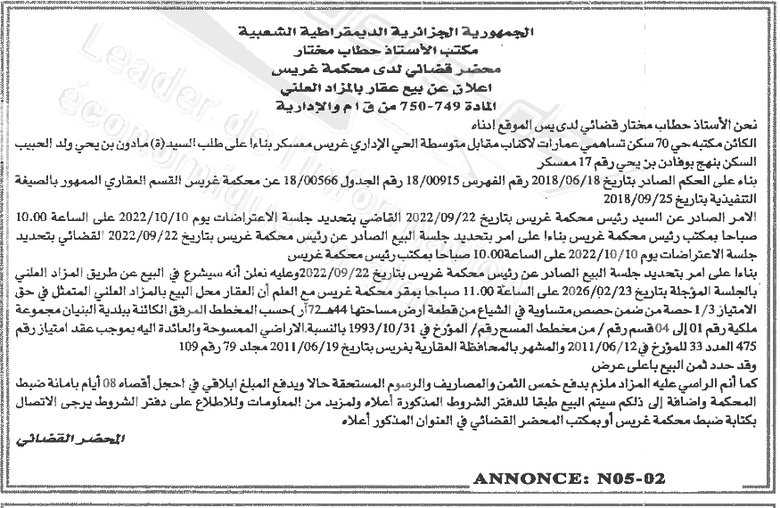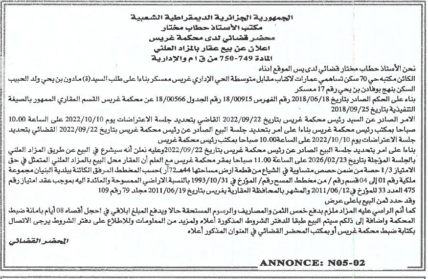 Il sera procédé à la vente au plus offrant et dernier enchérisseur le :