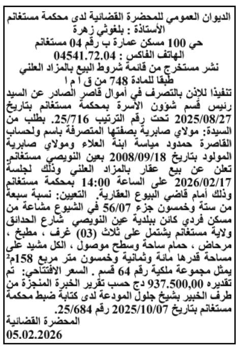 Il sera procédé à la vente au plus offrant et dernier enchérisseur le : 12/02/2026';