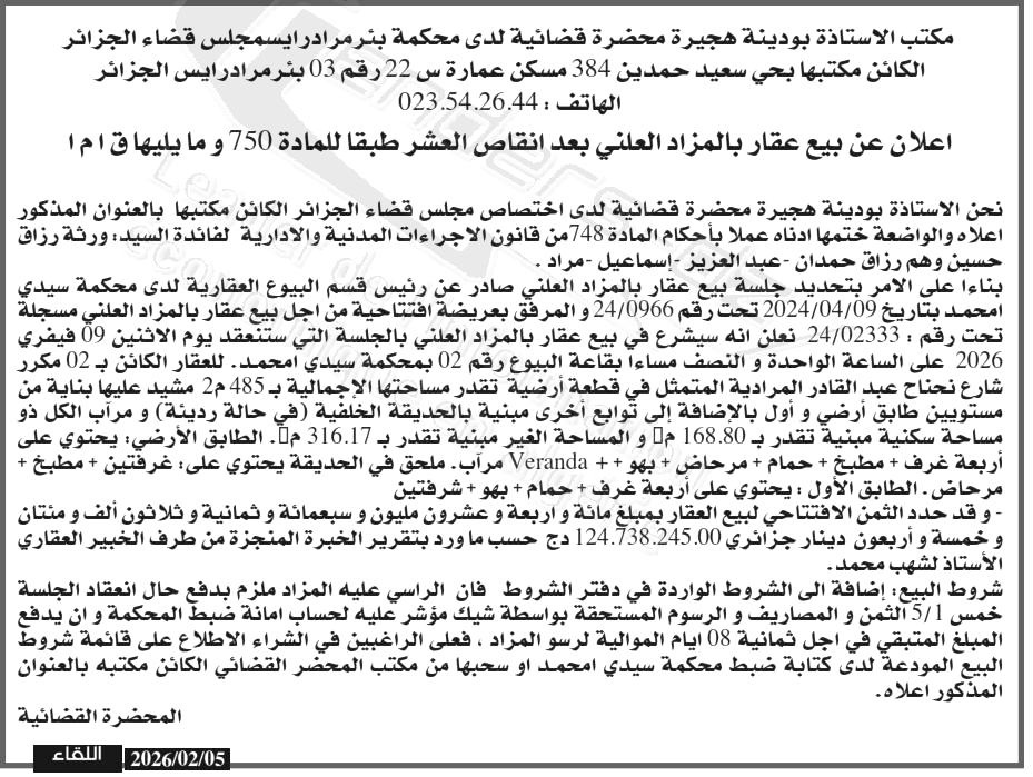 Il sera procédé à la vente au plus offrant et dernier enchérisseur le :