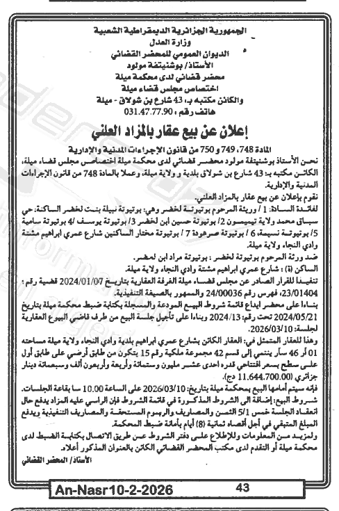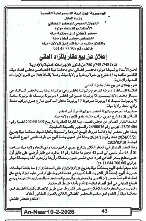 Il sera procédé à la vente au plus offrant et dernier enchérisseur le :