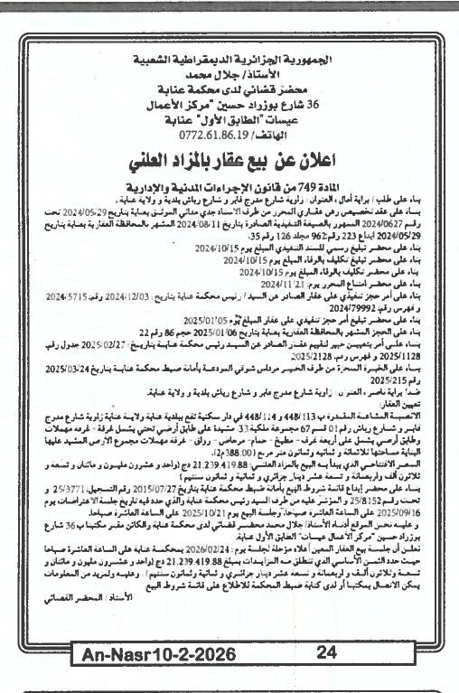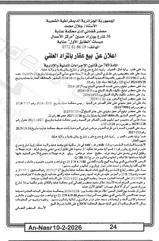 Il sera procédé à la vente au plus offrant et dernier enchérisseur le : 17/02/2026';