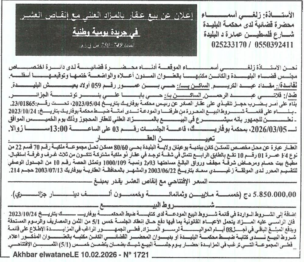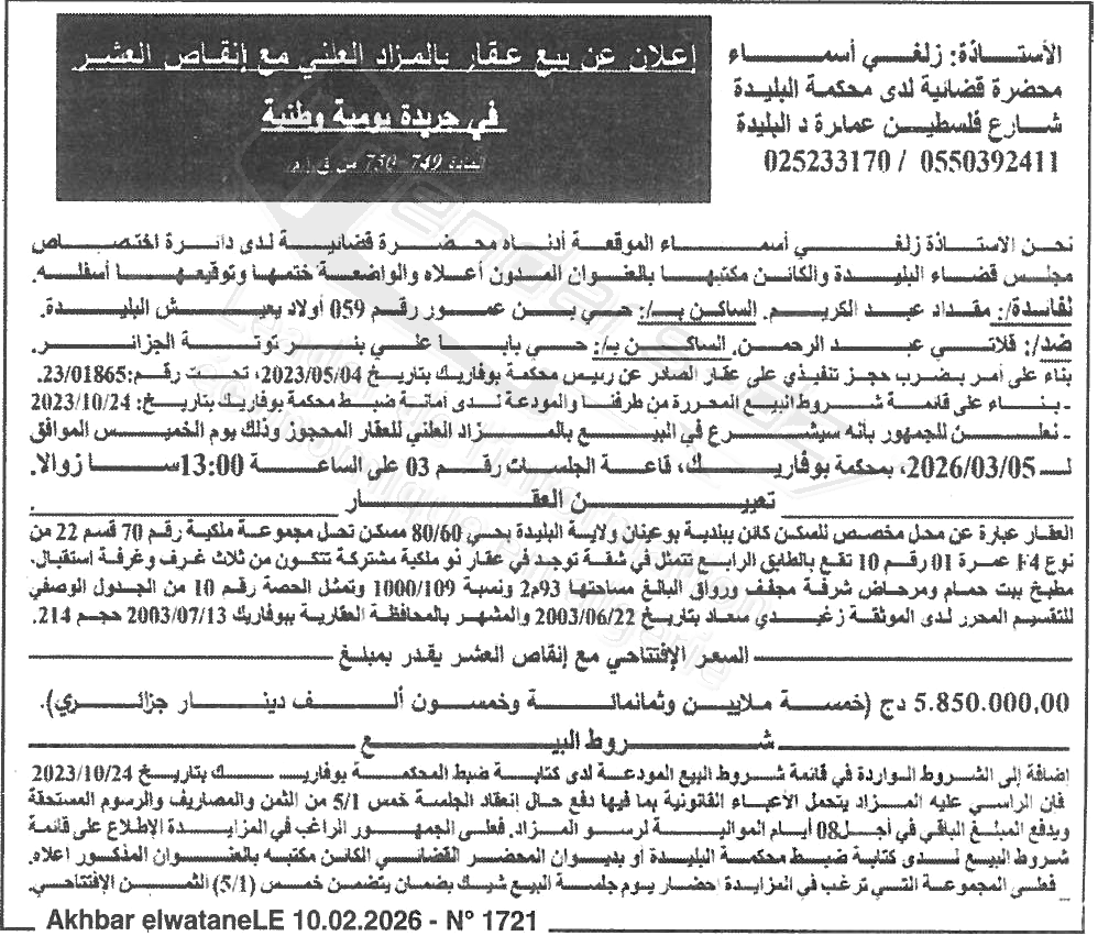 Il sera procédé à la vente au plus offrant et dernier enchérisseur le :