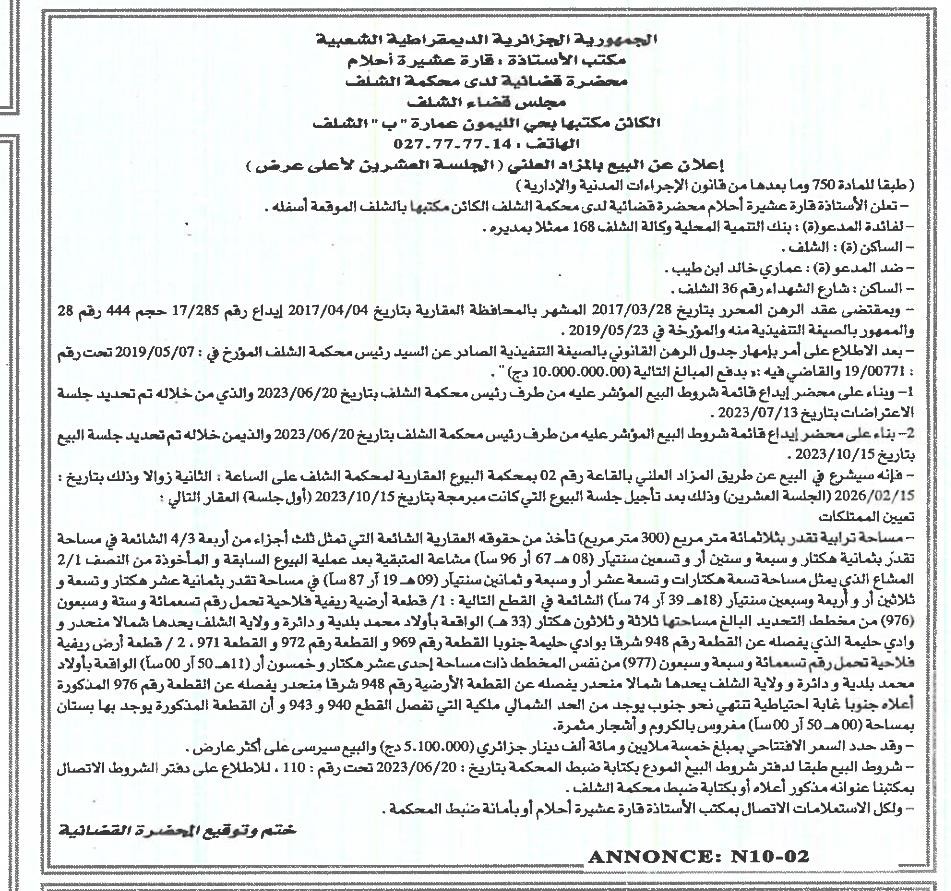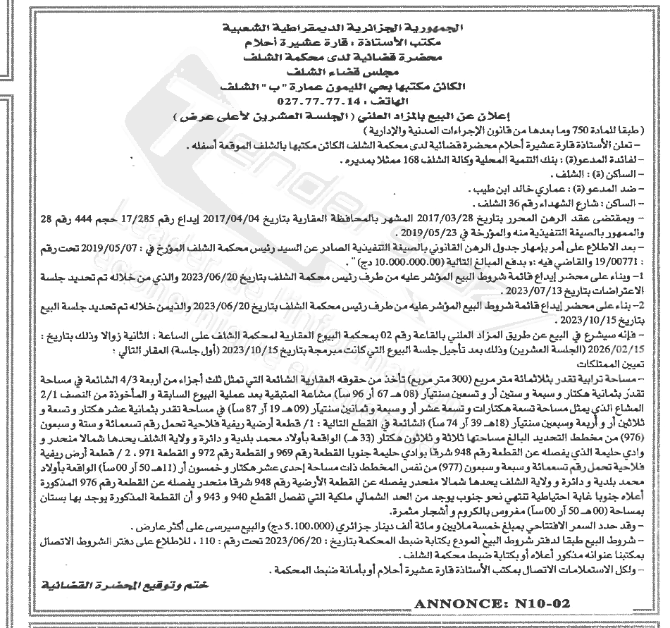 Il sera procédé à la vente au plus offrant et dernier enchérisseur le :