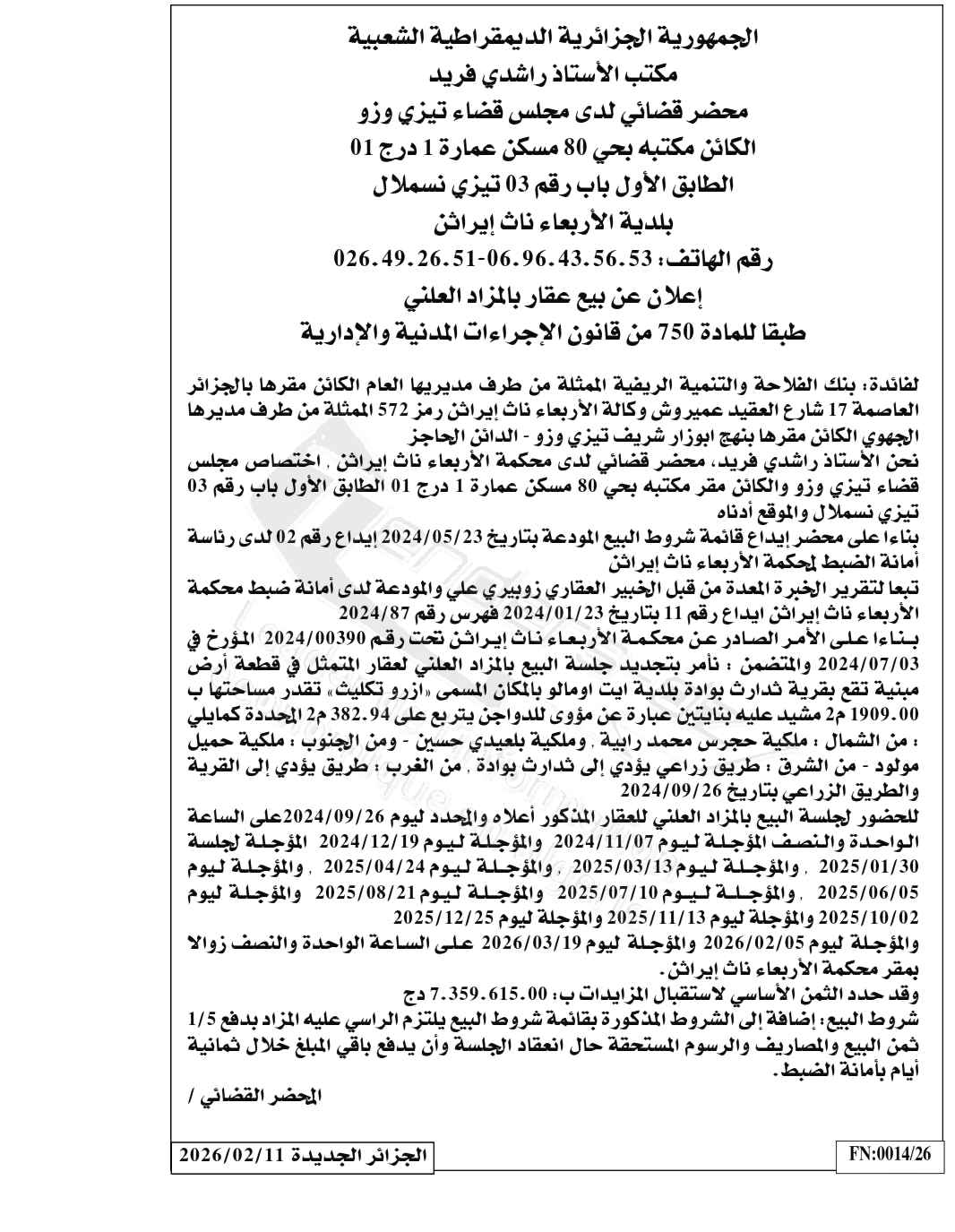 Il sera procédé à la vente au plus offrant et dernier enchérisseur le :
