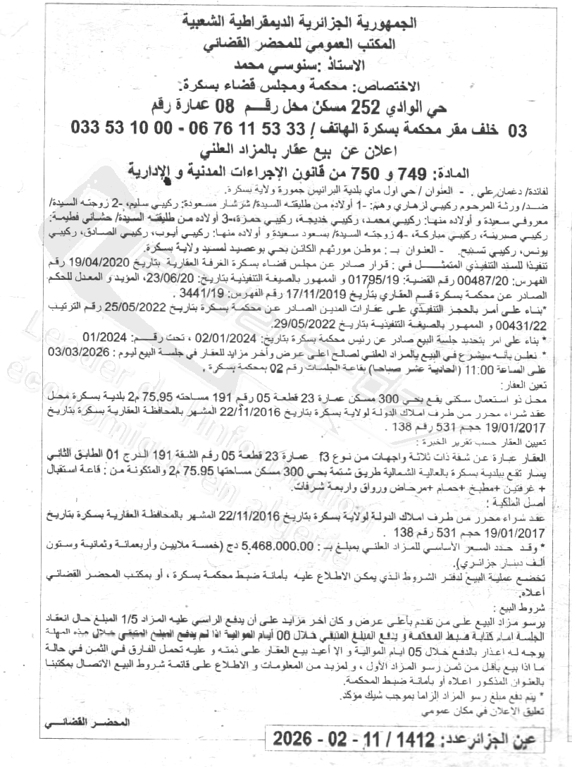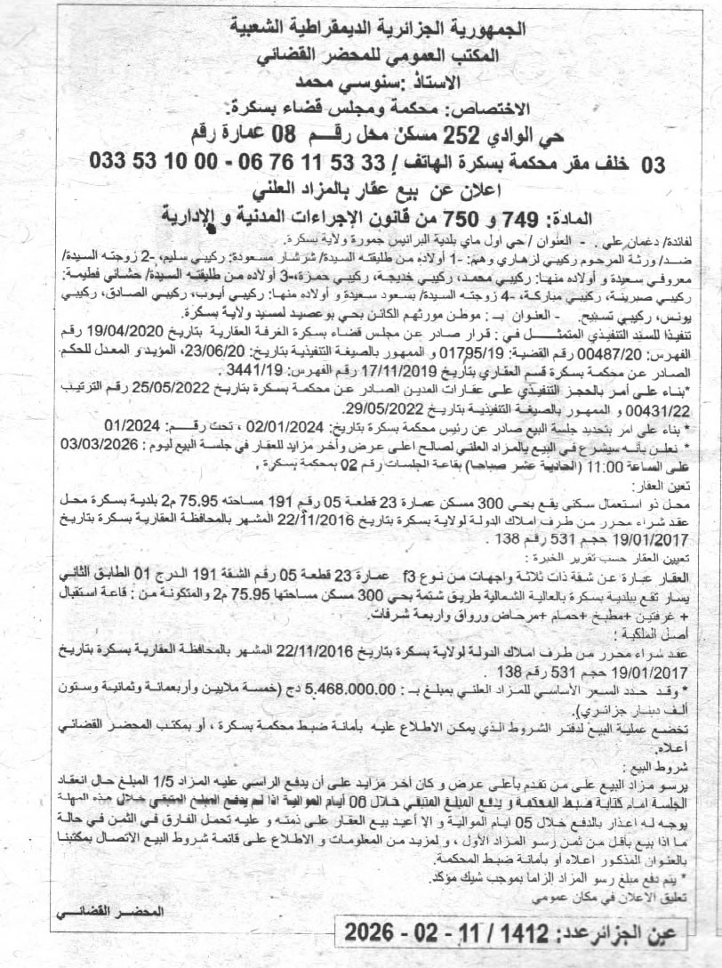 Il sera procédé à la vente au plus offrant et dernier enchérisseur le : 18/02/2026';