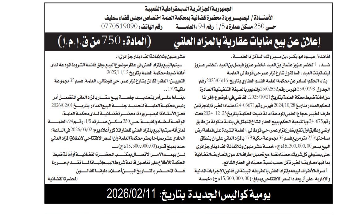 Il sera procédé à la vente au plus offrant et dernier enchérisseur le :
