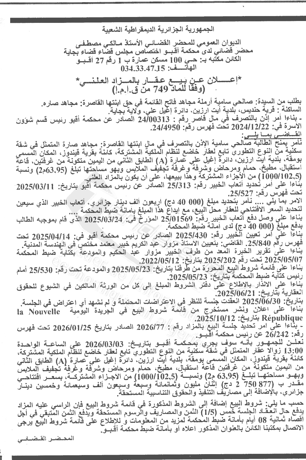Il sera procédé à la vente au plus offrant et dernier enchérisseur le :