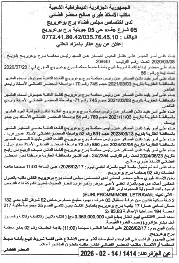 Il sera procédé à la vente au plus offrant et dernier enchérisseur le : 17/02/2026';