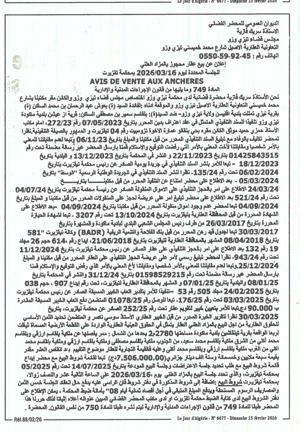 Il sera procédé à la vente au plus offrant et dernier enchérisseur le : 22/02/2026';