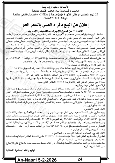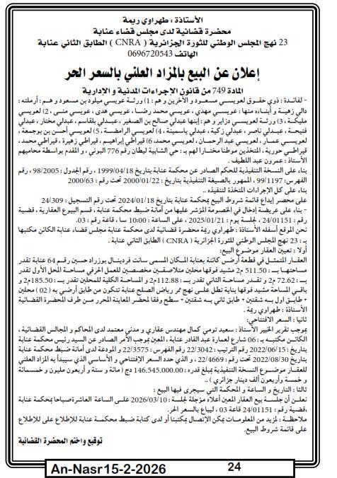 Il sera procédé à la vente au plus offrant et dernier enchérisseur le :