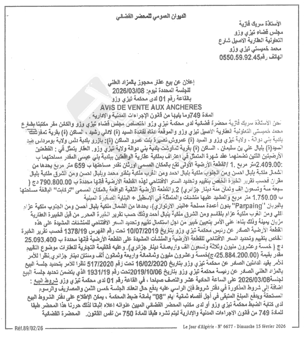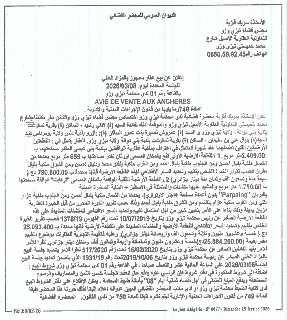 Il sera procédé à la vente au plus offrant et dernier enchérisseur le : 08/03/2026';