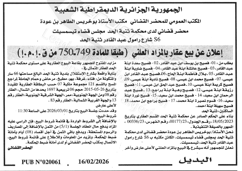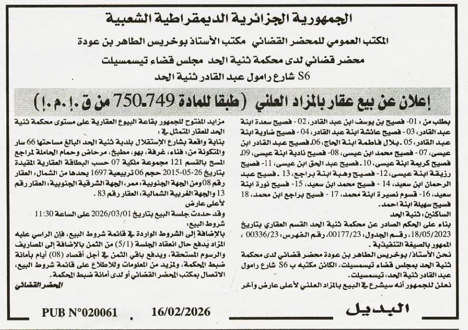 Il sera procédé à la vente au plus offrant et dernier enchérisseur le :