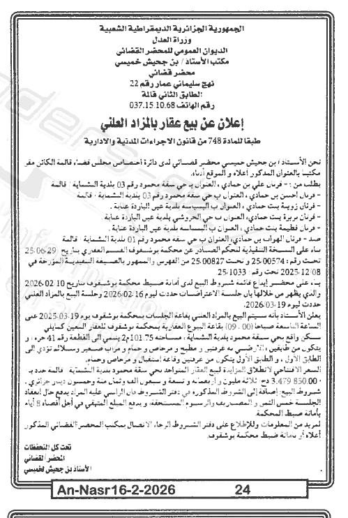 Il sera procédé à la vente au plus offrant et dernier enchérisseur le : 23/02/2026';