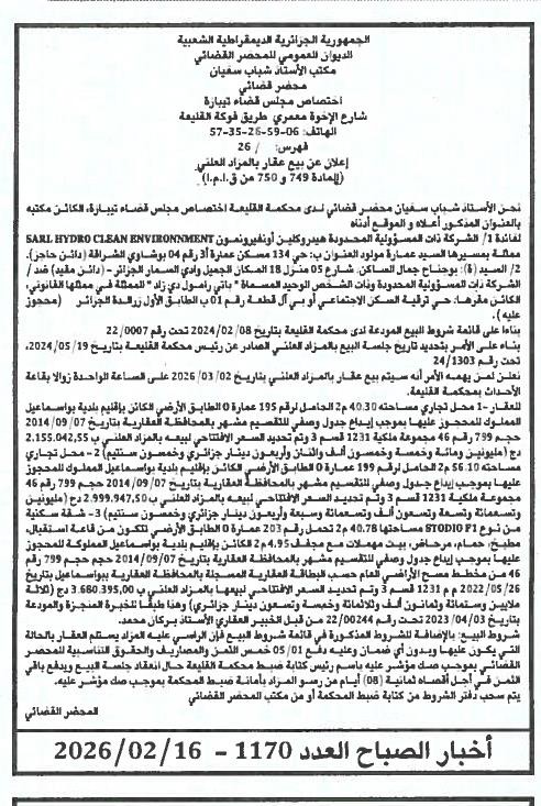 Il sera procédé à la vente au plus offrant et dernier enchérisseur le : 23/02/2026';