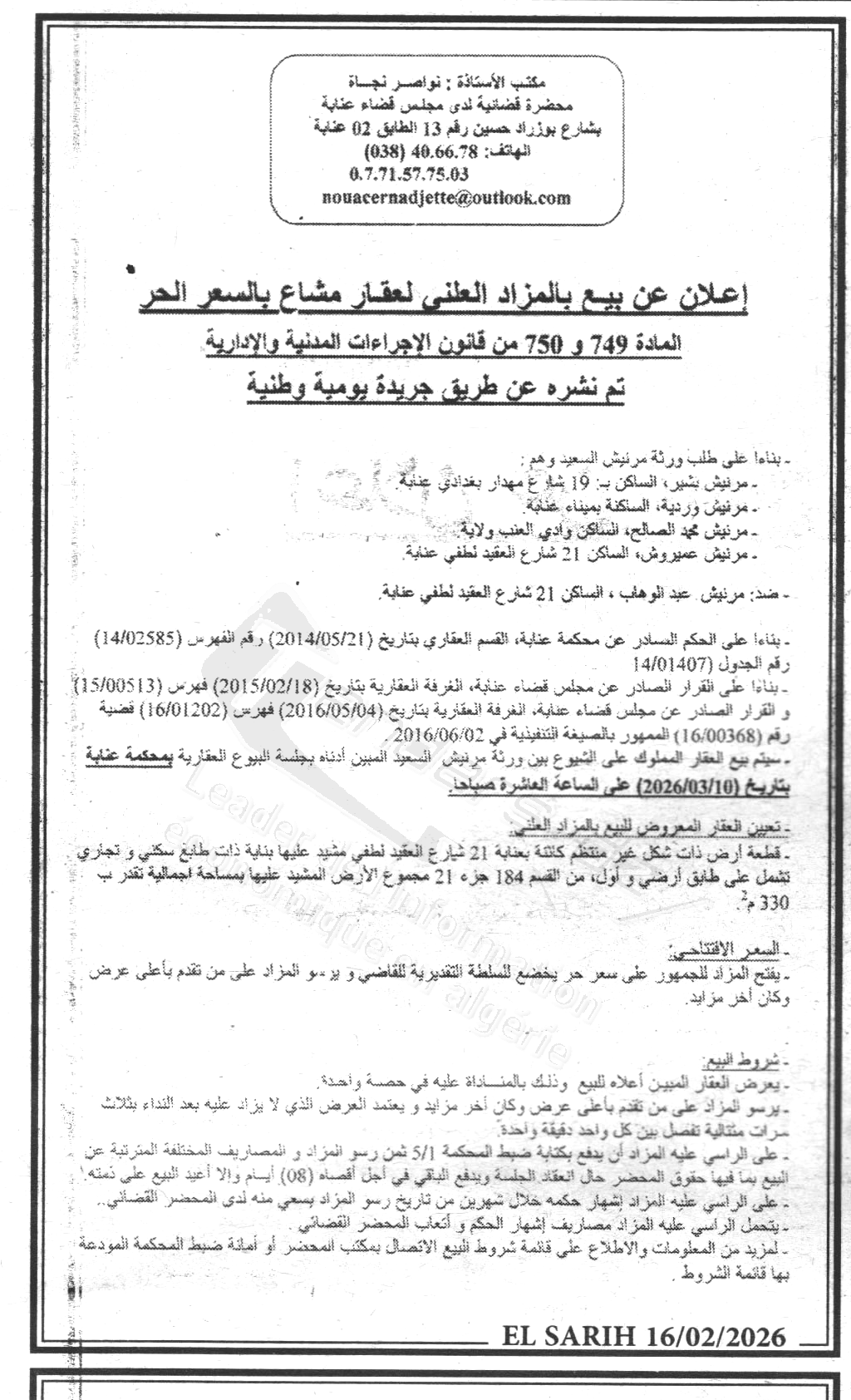 Il sera procédé à la vente au plus offrant et dernier enchérisseur le : 10/03/2026';