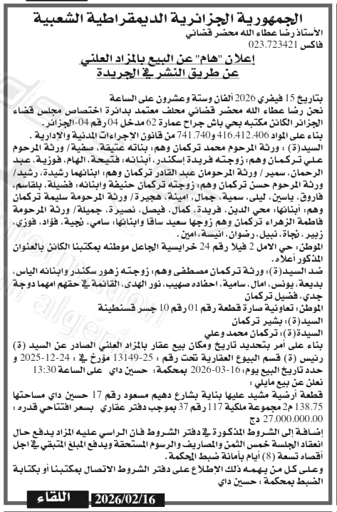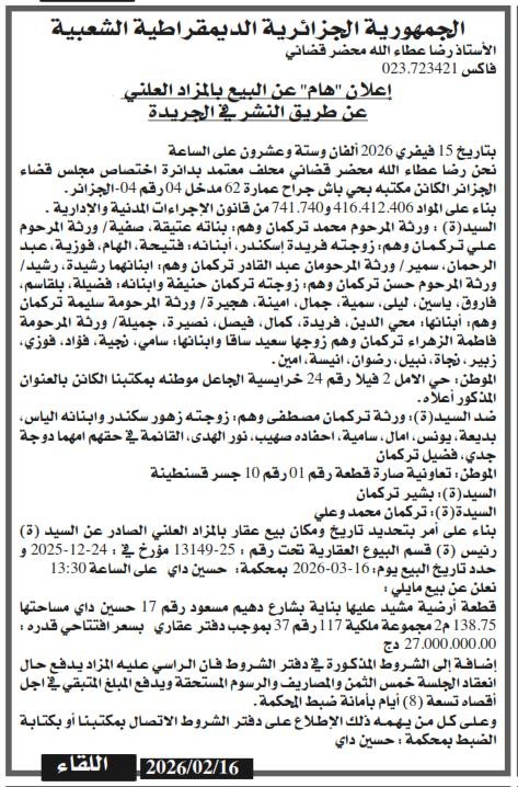 Il sera procédé à la vente au plus offrant et dernier enchérisseur le : 16/03/2026';