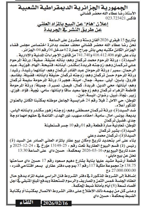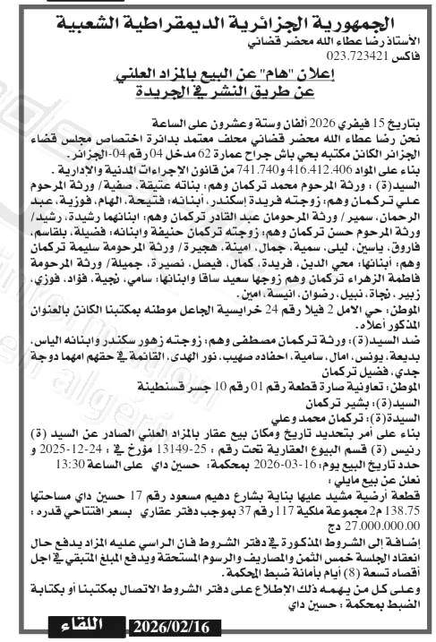 Il sera procédé à la vente au plus offrant et dernier enchérisseur le : 23/02/2026';