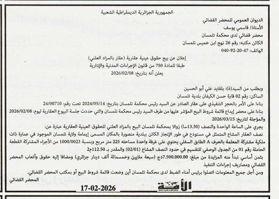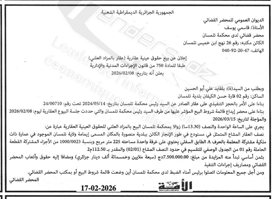 Il sera procédé à la vente au plus offrant et dernier enchérisseur le :