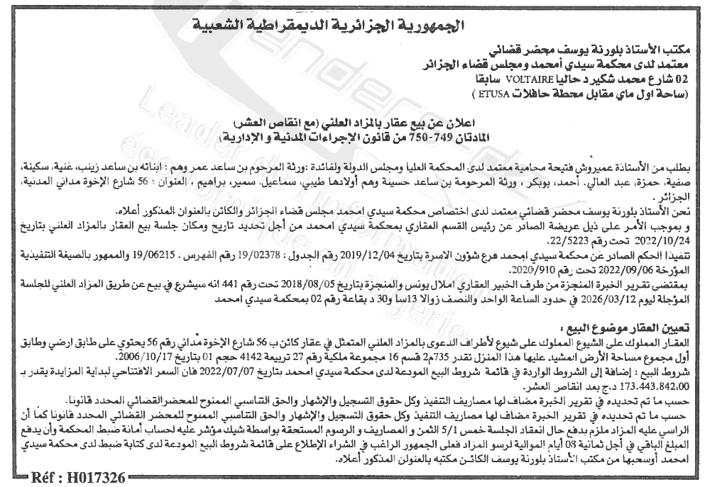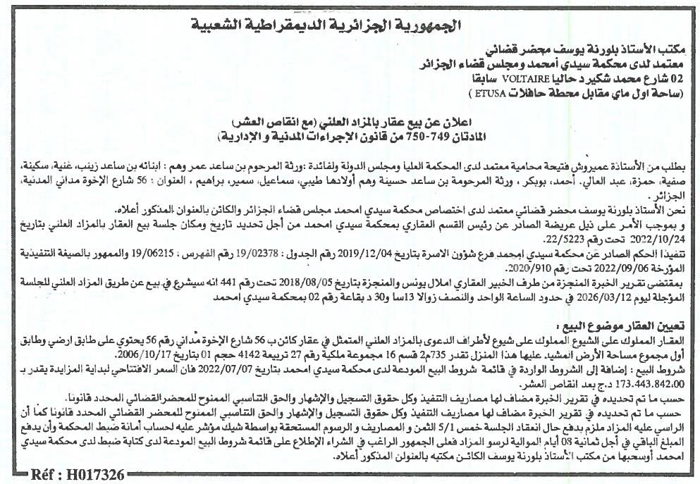 Il sera procédé à la vente au plus offrant et dernier enchérisseur le : 24/02/2026';