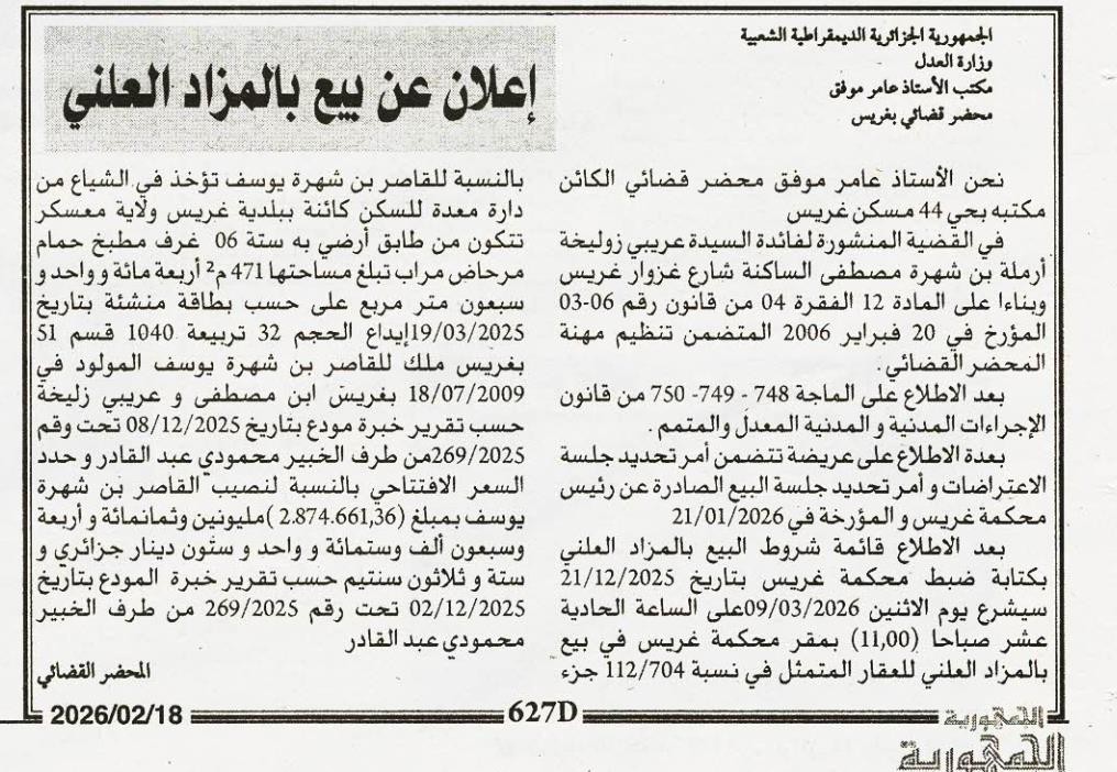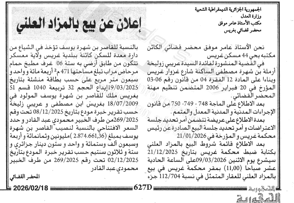 Il sera procédé à la vente au plus offrant et dernier enchérisseur le :