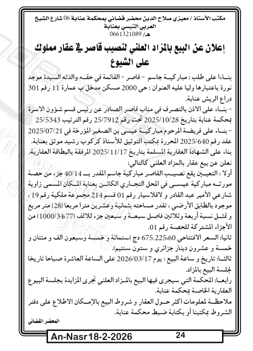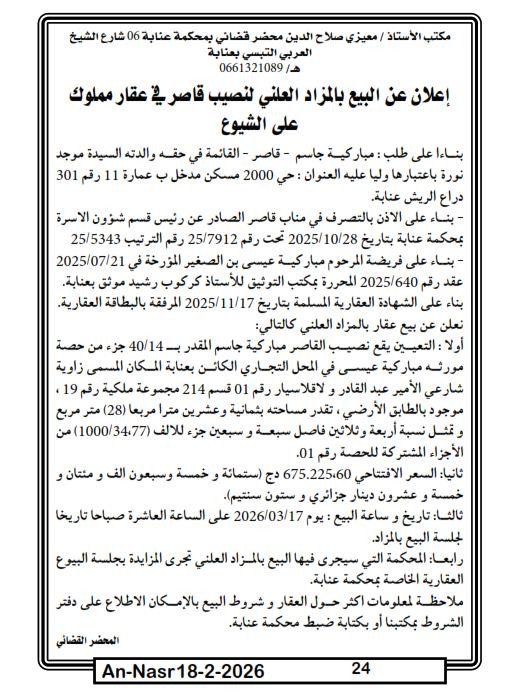 Il sera procédé à la vente au plus offrant et dernier enchérisseur le :